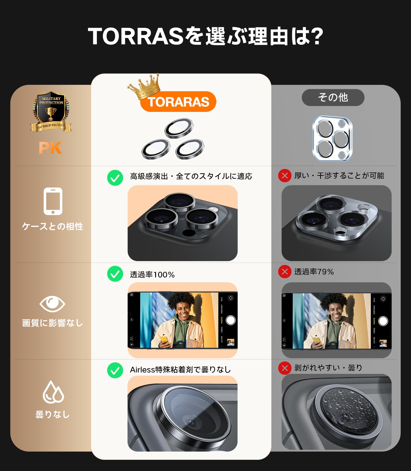【宇宙航空材料・元のまま再現】 TORRASカメラフィルム レンズフィルム 強化ガラス 黒縁取り 1セット 高級感演出 カメラカバー LensGuard