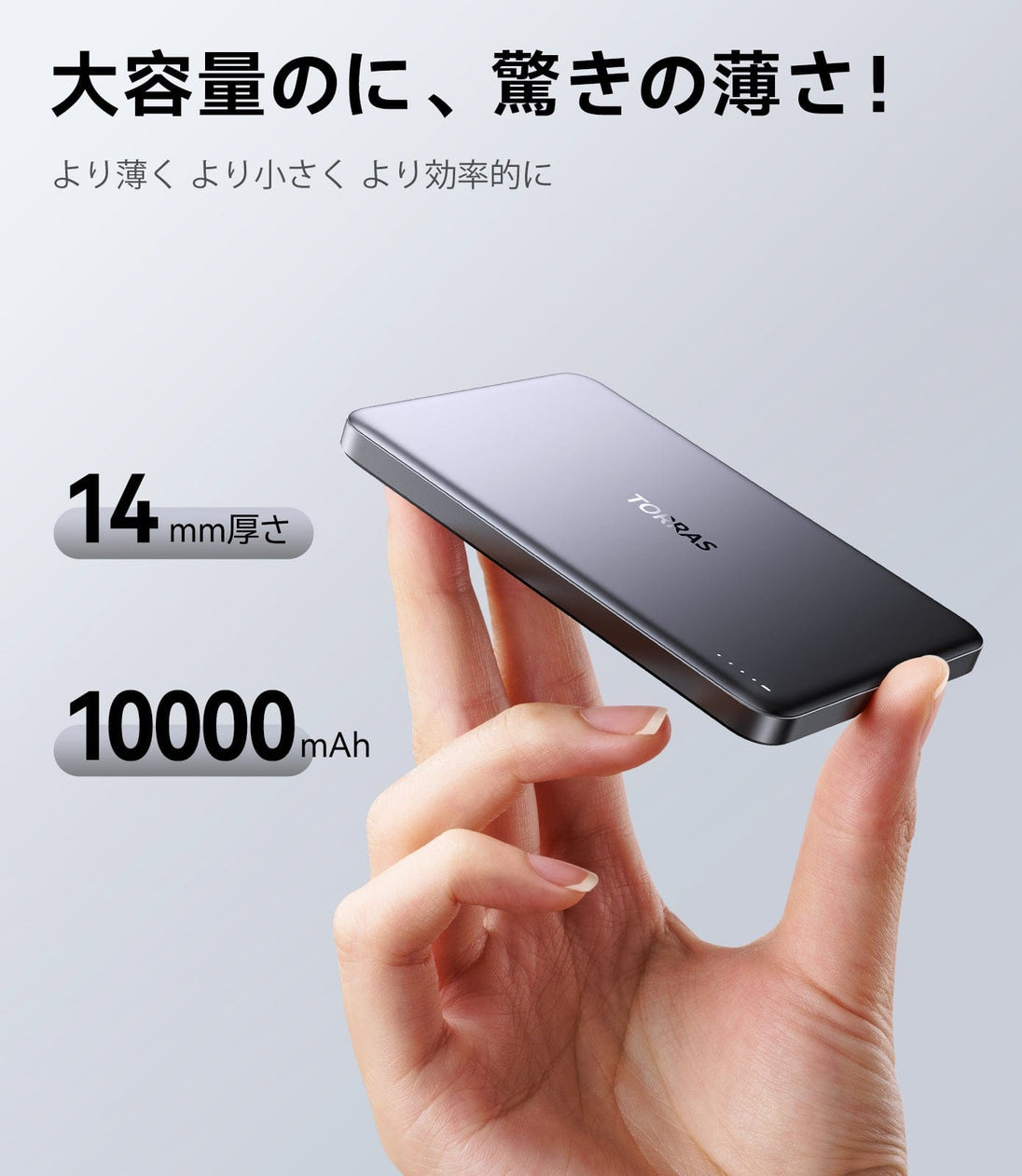 TORRAS MiniMagは10000mAhの薄型モバイルバッテリーで、iPhone 15に約2回、iPad miniに約1回以上充電可能。