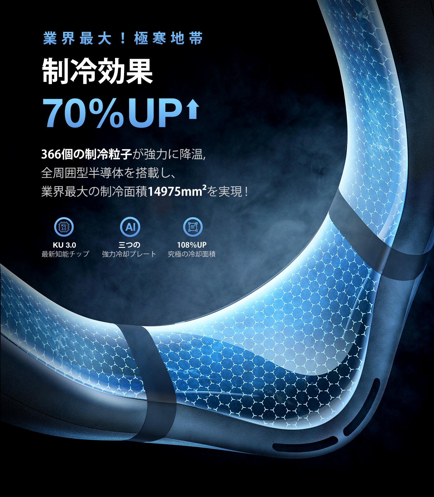 最新のKU 3.0チップとグラフェン技術を搭載し、瞬時に降温を実現。3枚の冷却プレートが首を囲み、40°Cの夏でも体感温度を20°C下げます。中暑を防ぎ、快適な涼しさを提供します。