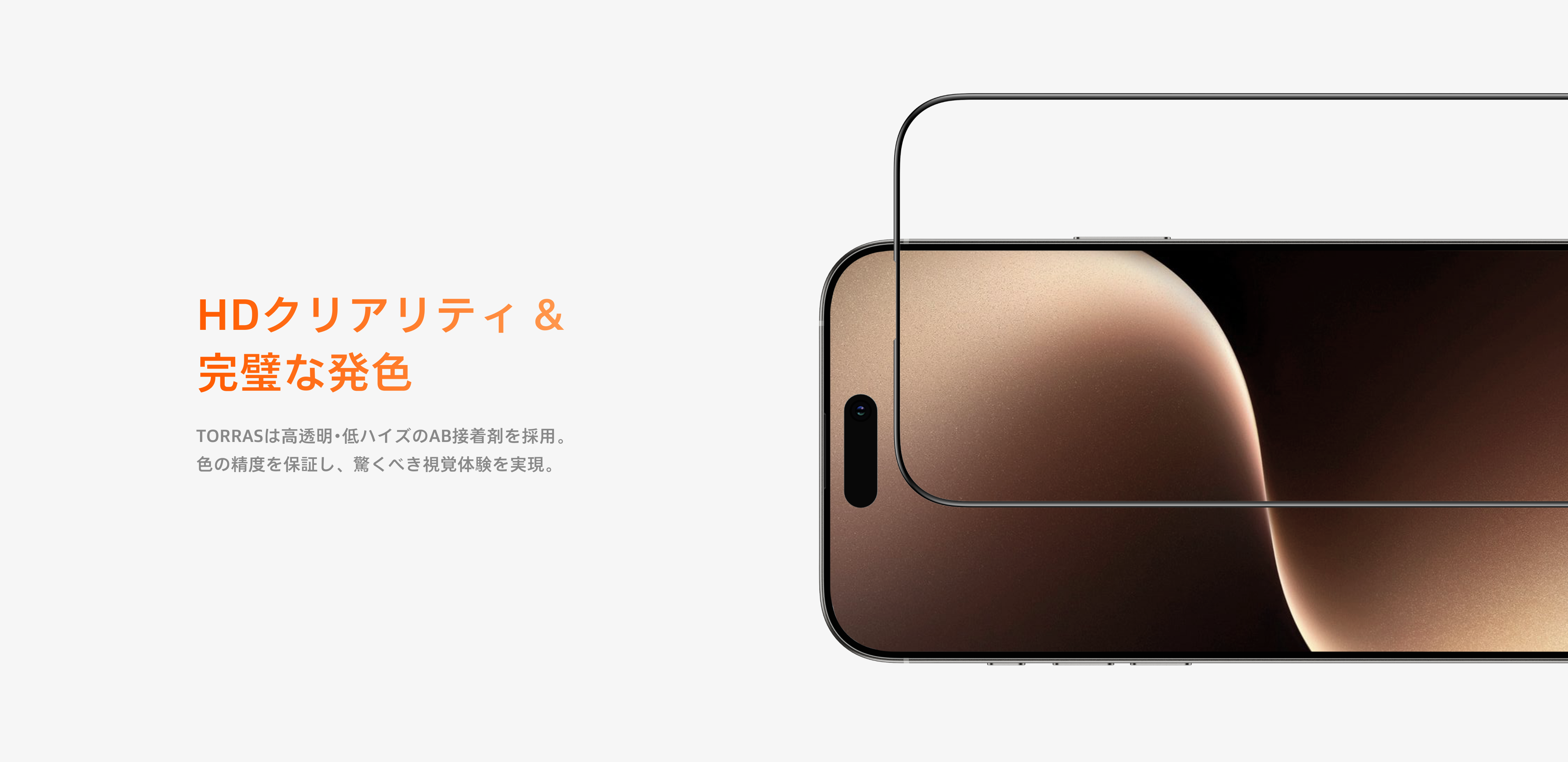TORRAS独自開発の強化ガラスが、うっかり落とす衝撃や擦り傷から、あなたのスマホを守る最後の砦です。