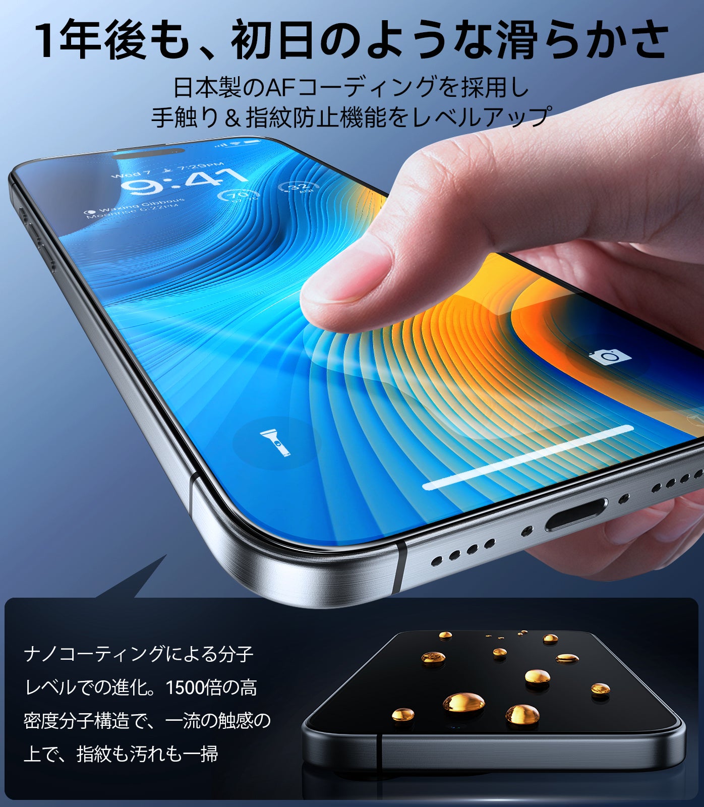 - 特長: 表面硬度9H、指紋防止、高感度タッチ、耐衝撃、傷防止