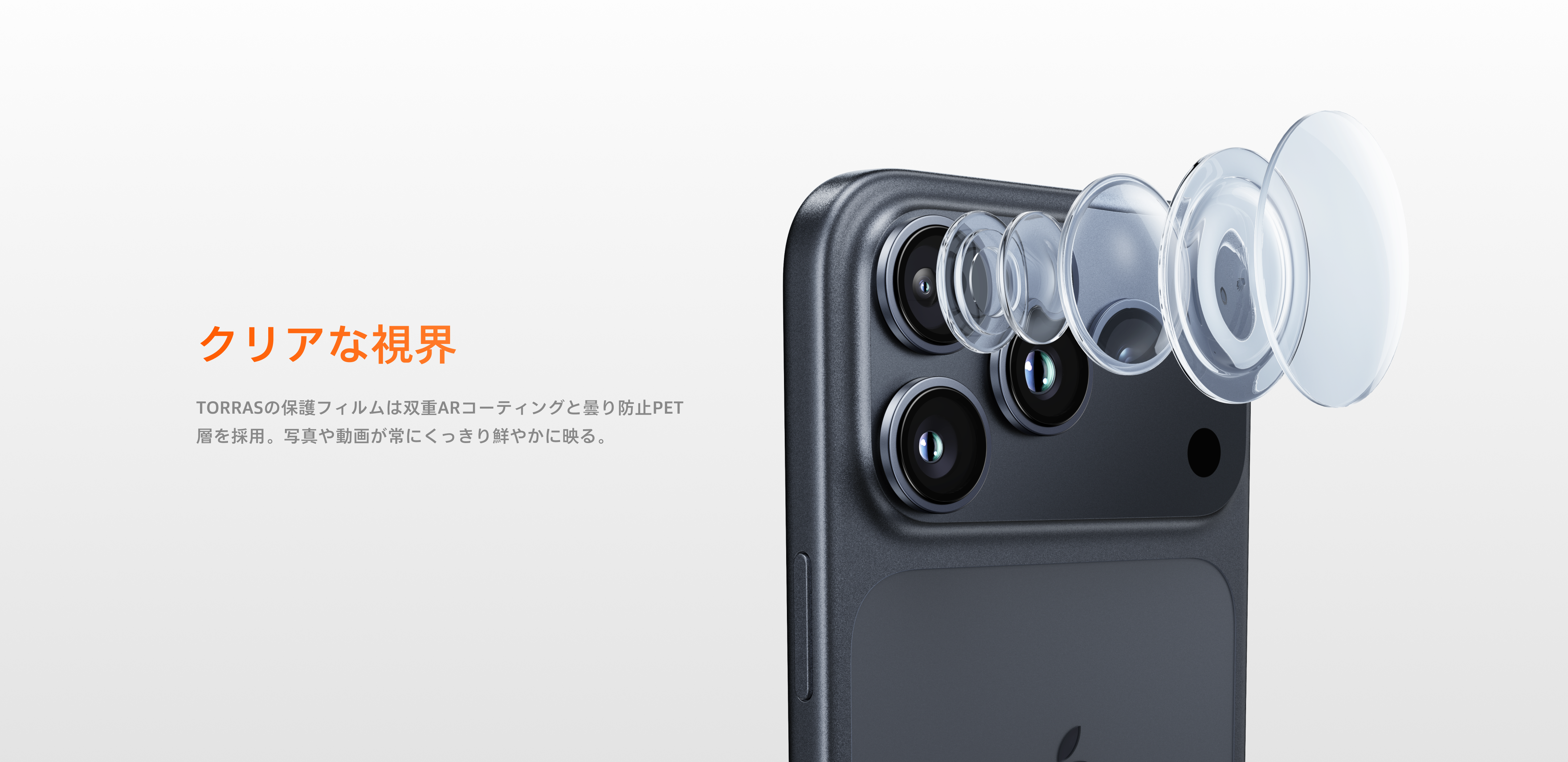 TORRASの高強度素材が割れないシールドを形成。 日常の摩擦や衝撃からレンズを守ります。