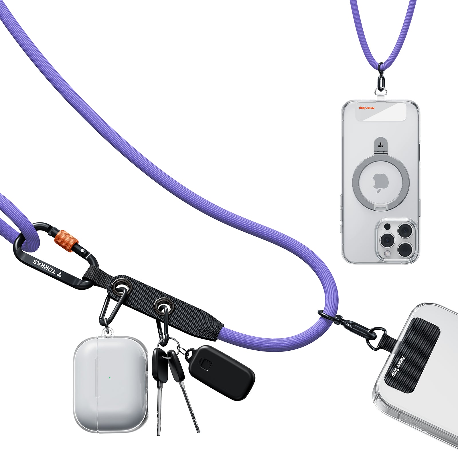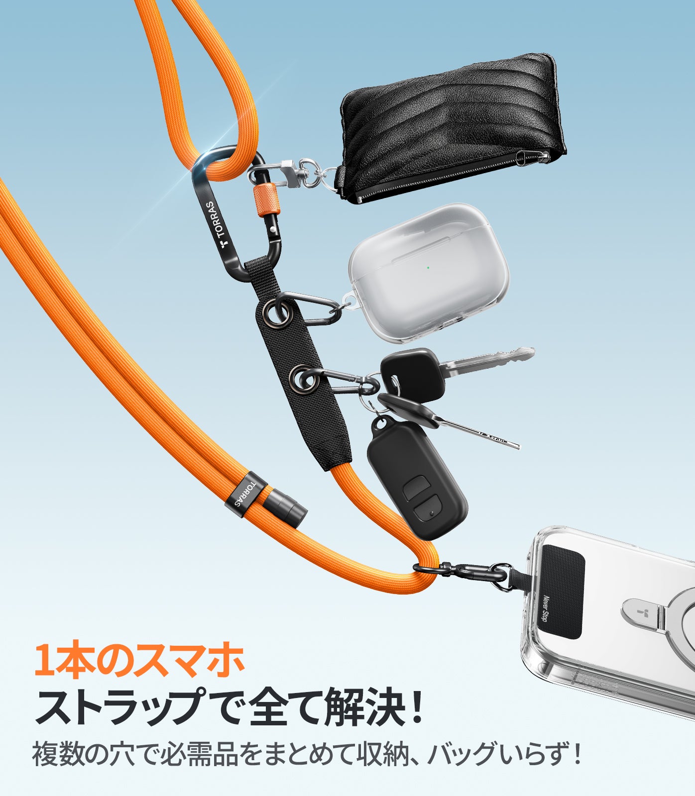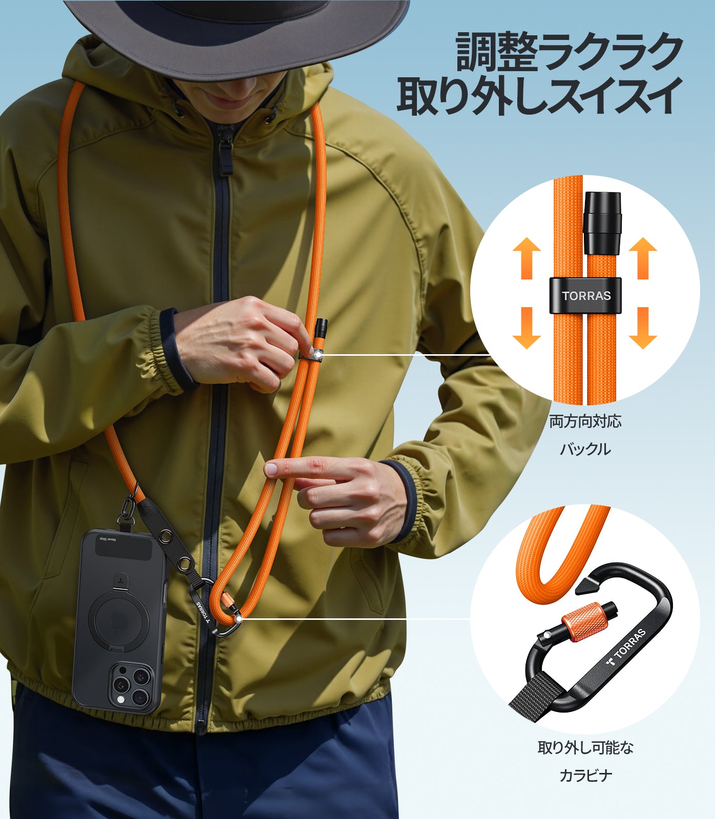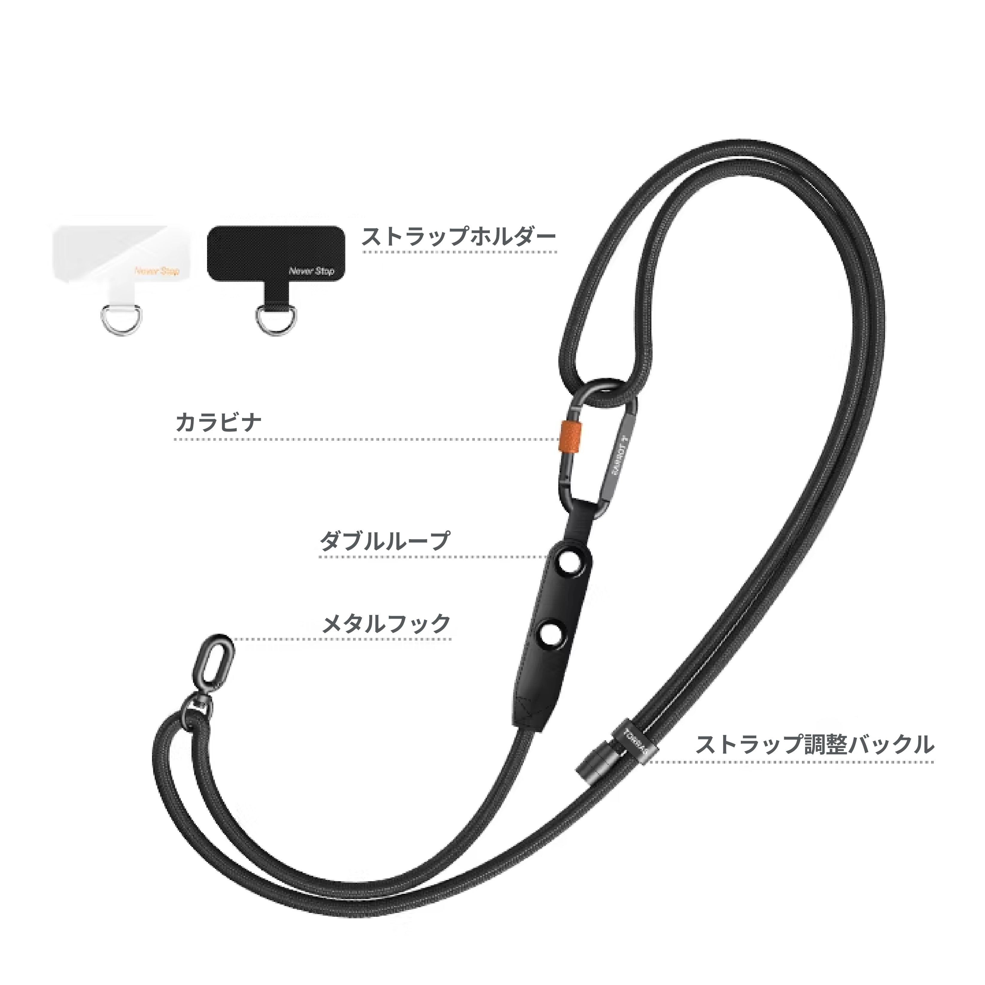 - 長さは49〜86cmに調節でき、自分に合ったフィット感に。イヤホンやポーチなどが掛けられるダブルループ。