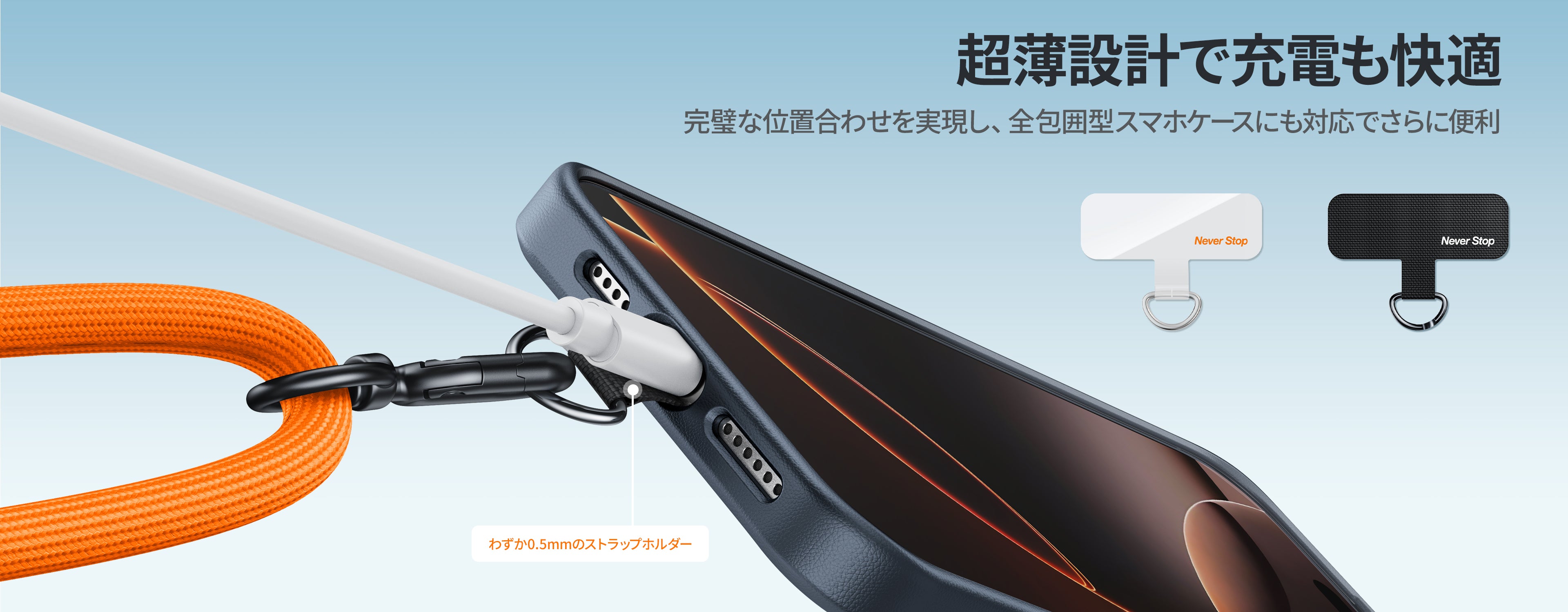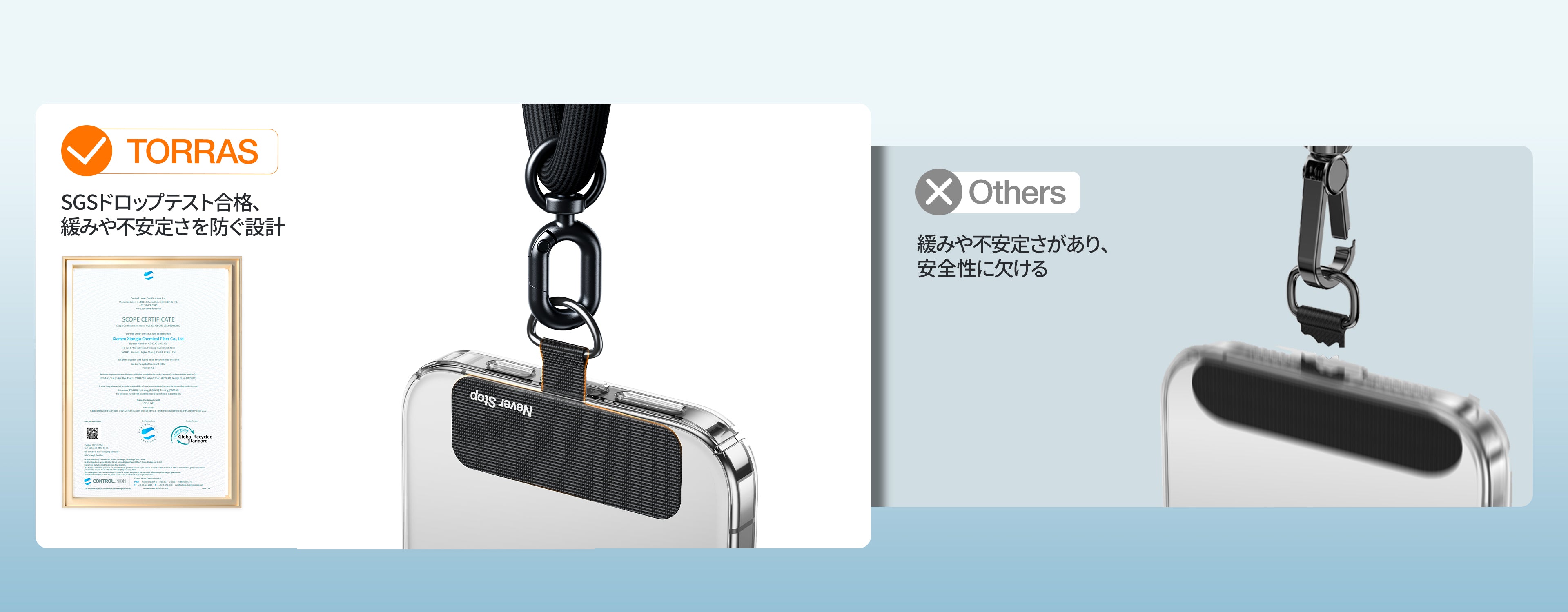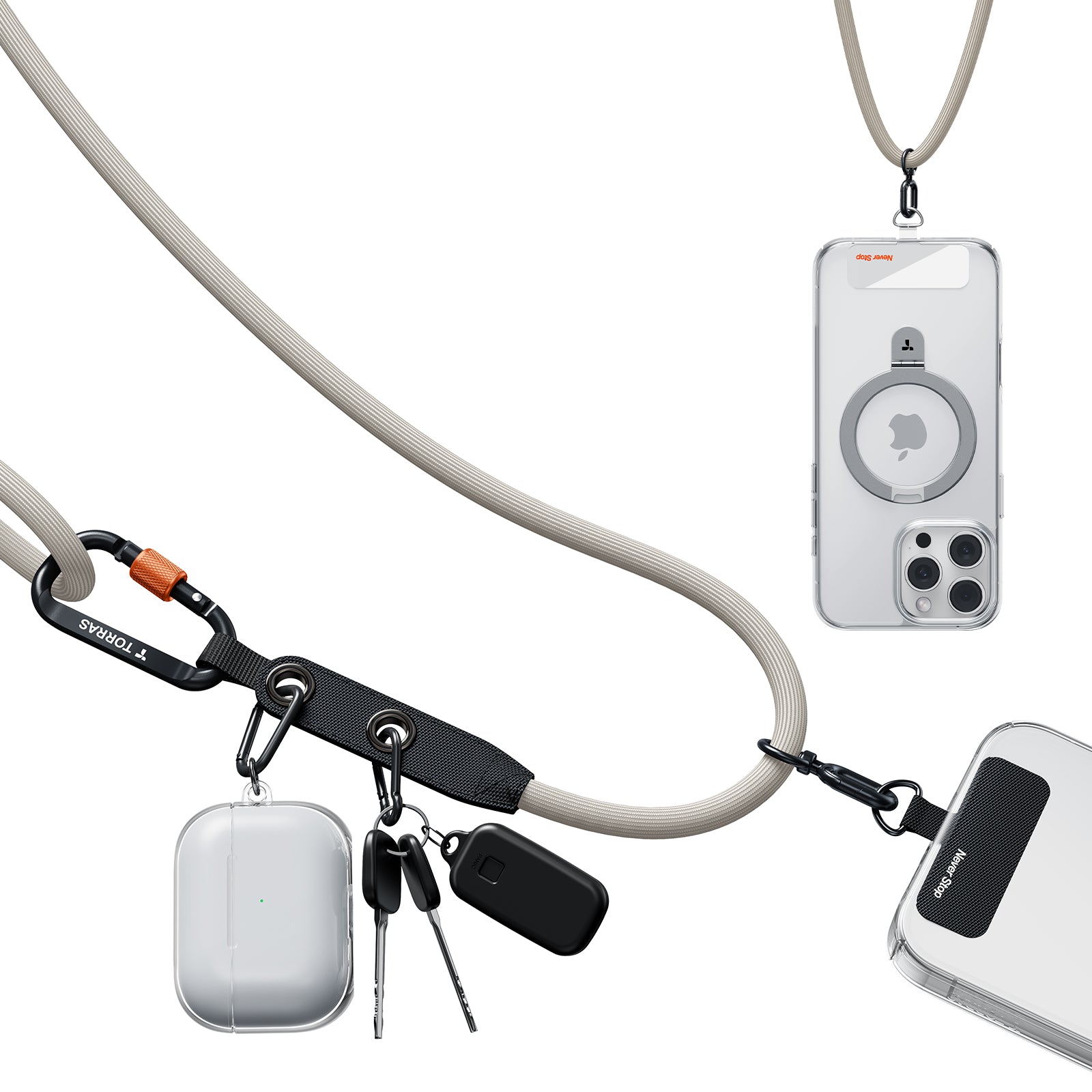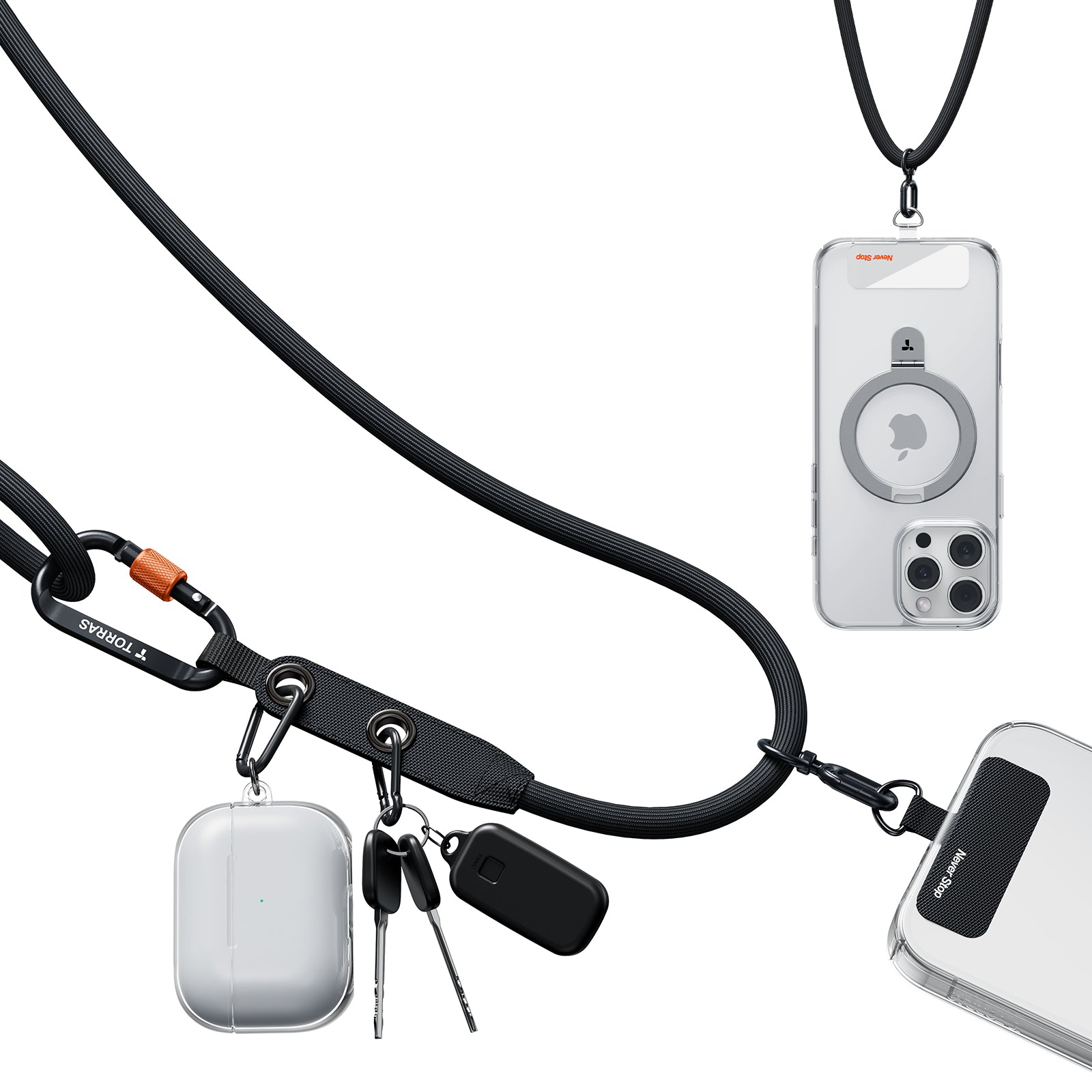 - 長さは49〜86cmに調節でき、自分に合ったフィット感に。イヤホンやポーチなどが掛けられるダブルループ。