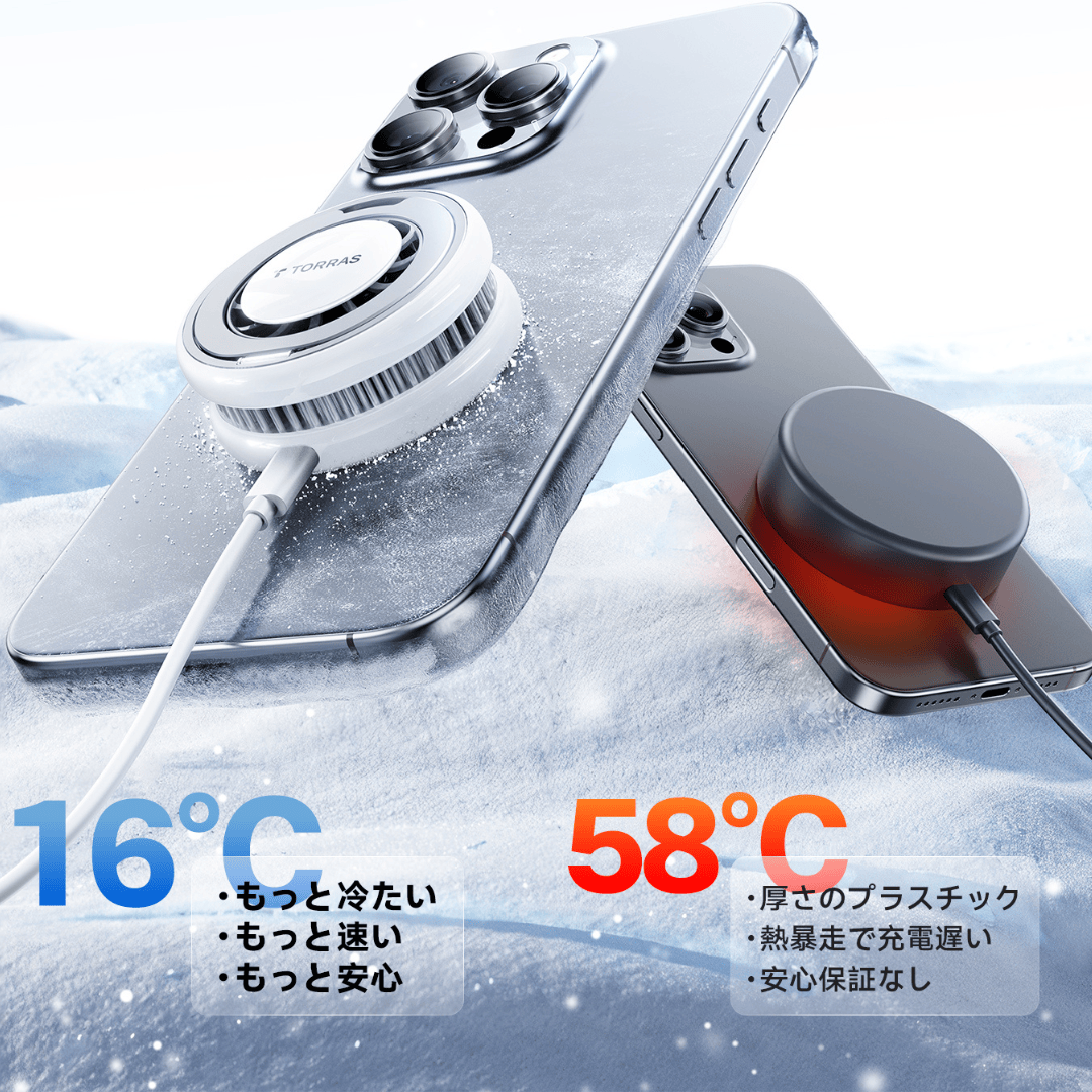 - 【革新的な冷却性能・スマホバッテリーを守る】 iPhoneをワイヤレス充電する際の「発熱問題」が気になりませんか?TORRAS独自開発 「PolarCircle」冷却システムは、TEC(ペルティエ素子)プレートと高速静音ファンを組み合わせ、発生した熱を効率よく排出。充電開始からわずか10秒で温度を約10℃低下させます。最新チップを搭載したiPhone17は、高負荷のゲームや4K録画、AI処理などで従来以上に発熱しやすい設計ですが、本製品を使えば温度上昇を効果的に抑制。快適にプレイや撮影を楽しめるだけでなく、バッテリー寿命の延長にもつながります。 ※冷却効果はご使用環境や周囲の温度、個人の感じ方によって差が生じる場合がございます。モバイルバッテリーを接続しながらのご利用はおすすめいたしません。