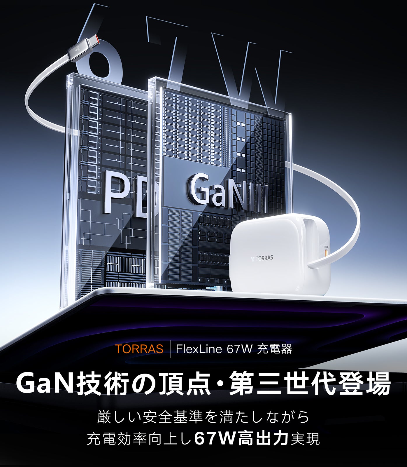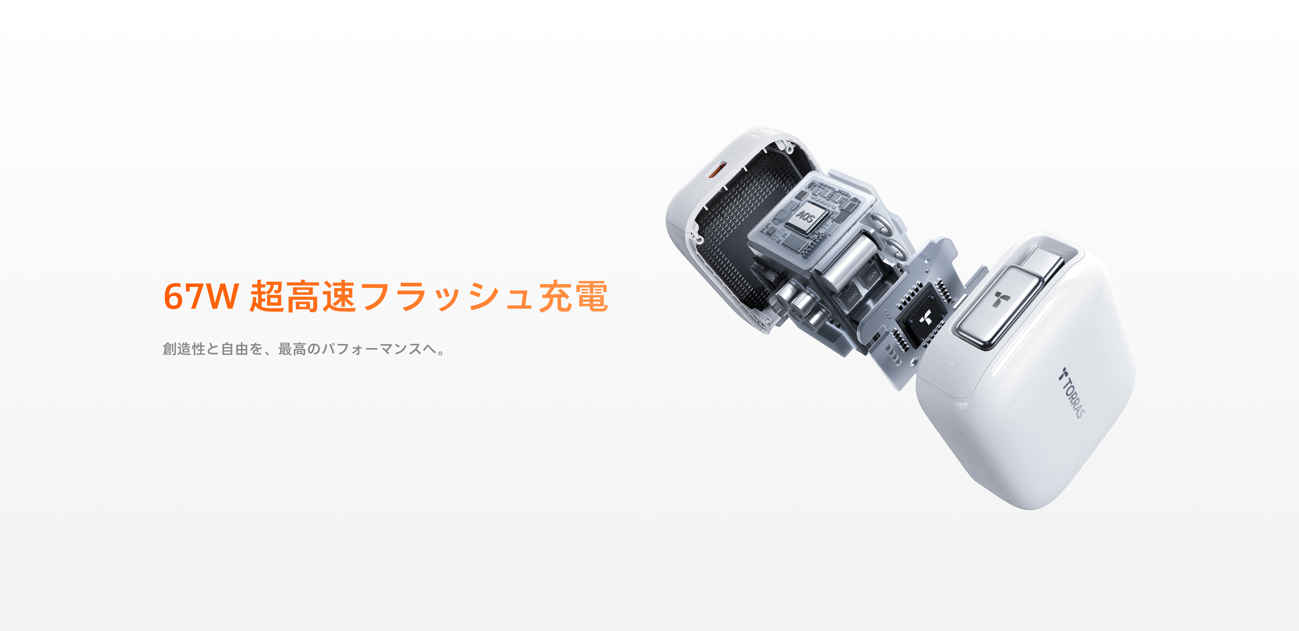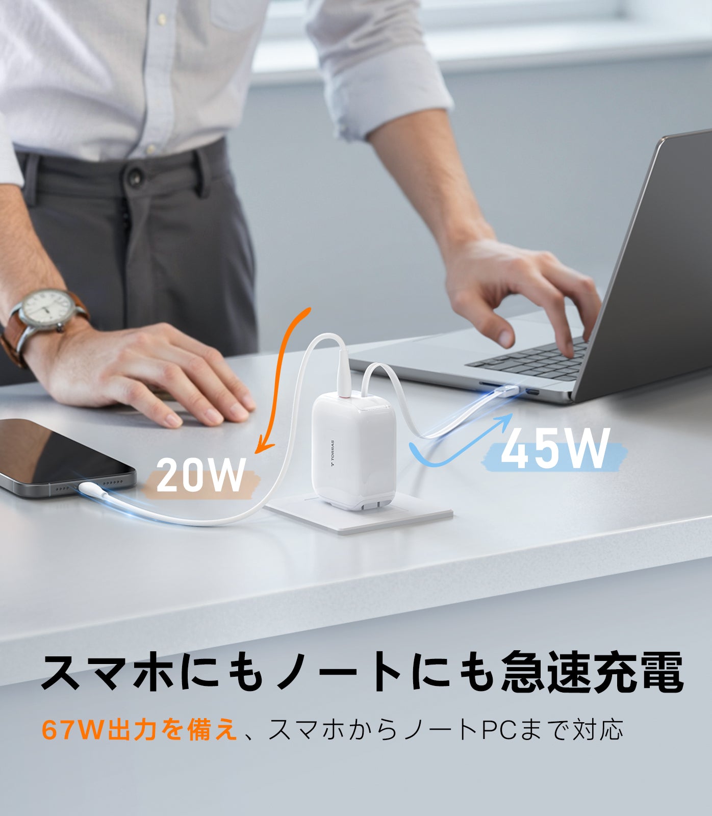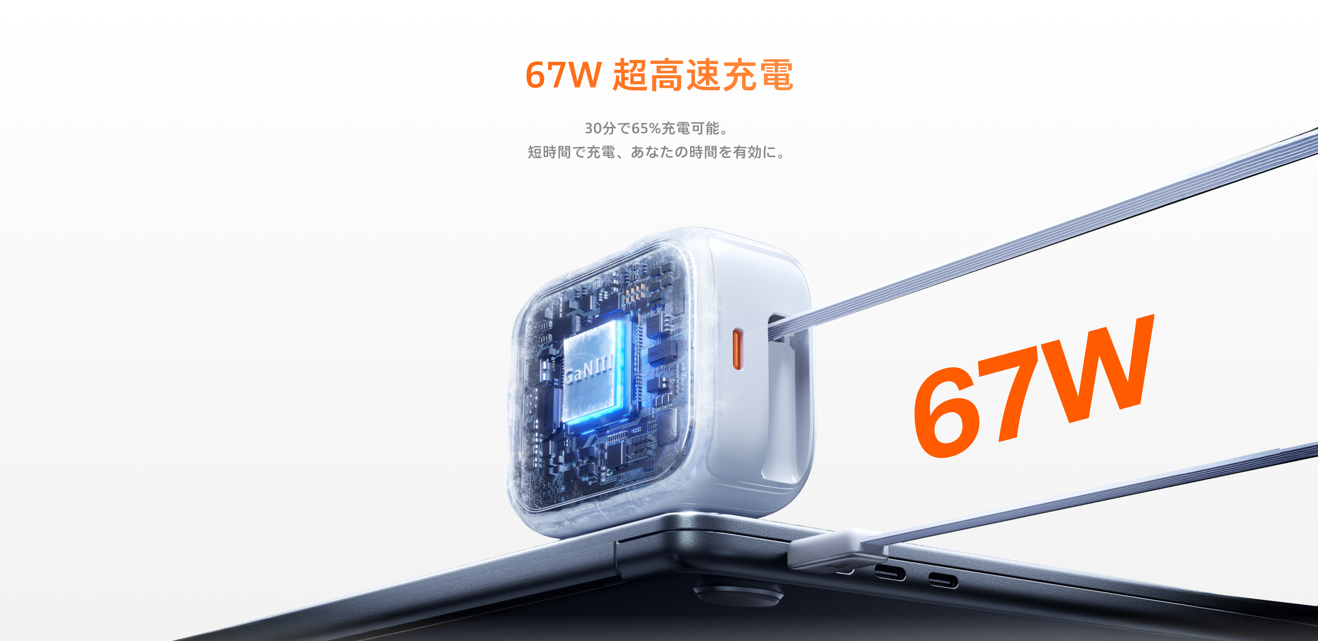 - 67W 高出力で多機種に対応:単ポート最大 67W 出力、PD3.1 など主流規格をサポート。MacBook Pro を 50 分で 50% まで充電可能で、1 台でスマホと PC の急速充電に対応。
