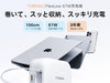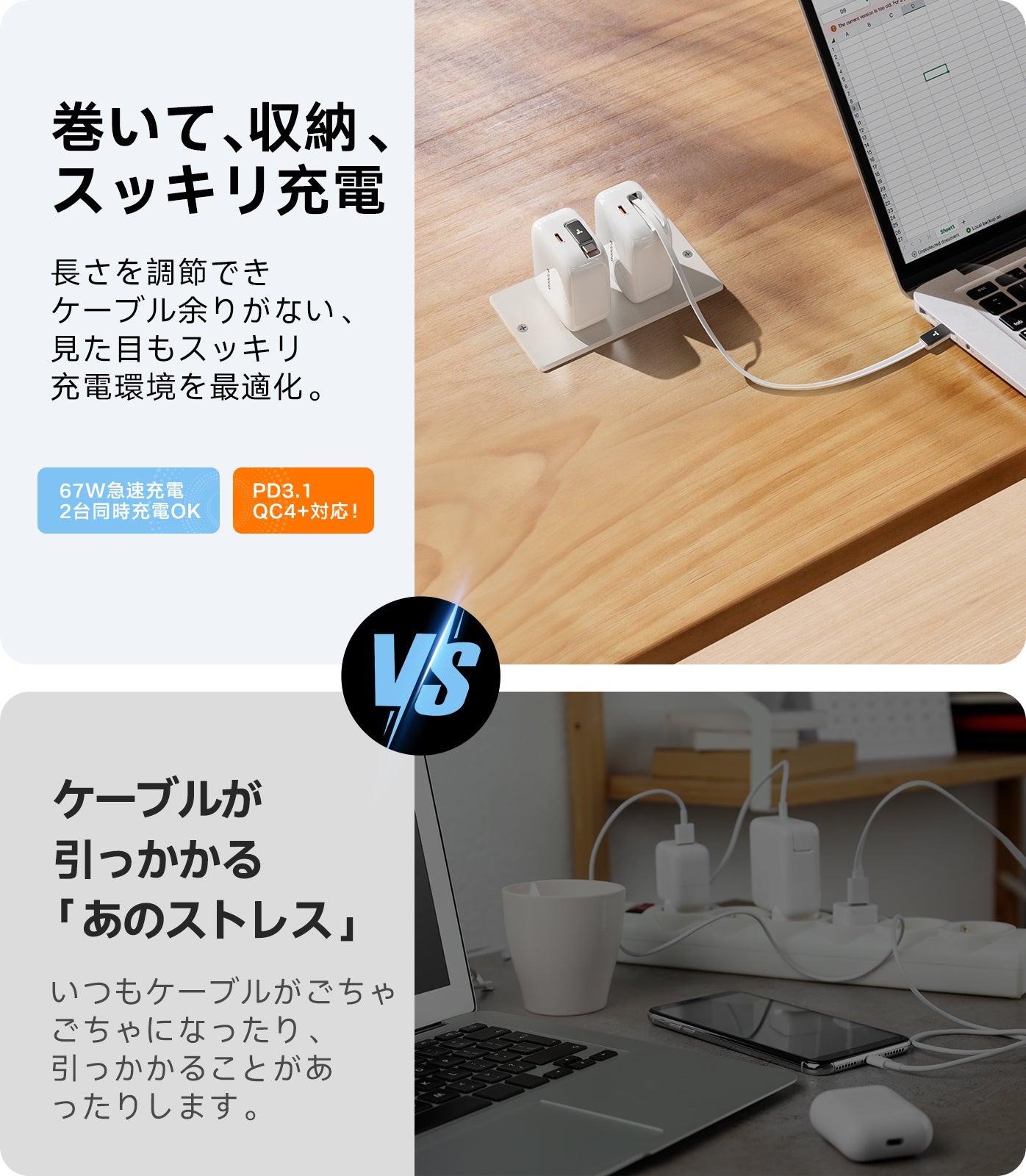 - 100cm の超長尺本体付属ケーブルを搭載、遠距離の電源にも自在に対応。デスクでの使用から外出場面まで幅広く適用可能で、自動巻き取り設計により収納も簡便。