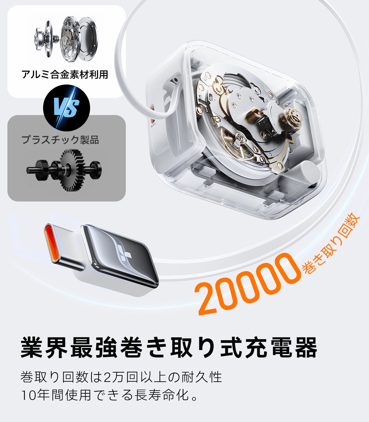 - 100cm 超長ケーブル内蔵、自動巻き取り収納