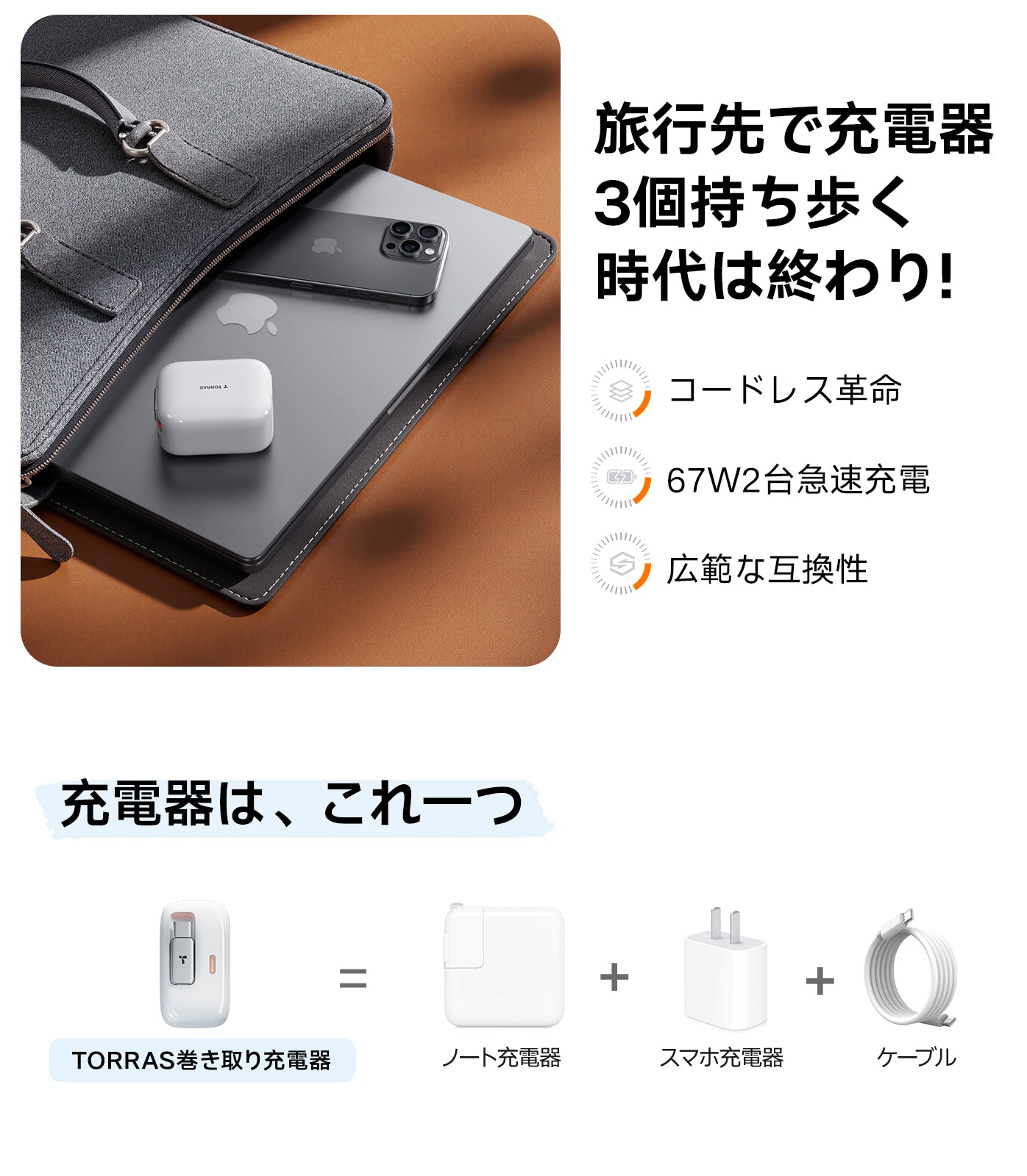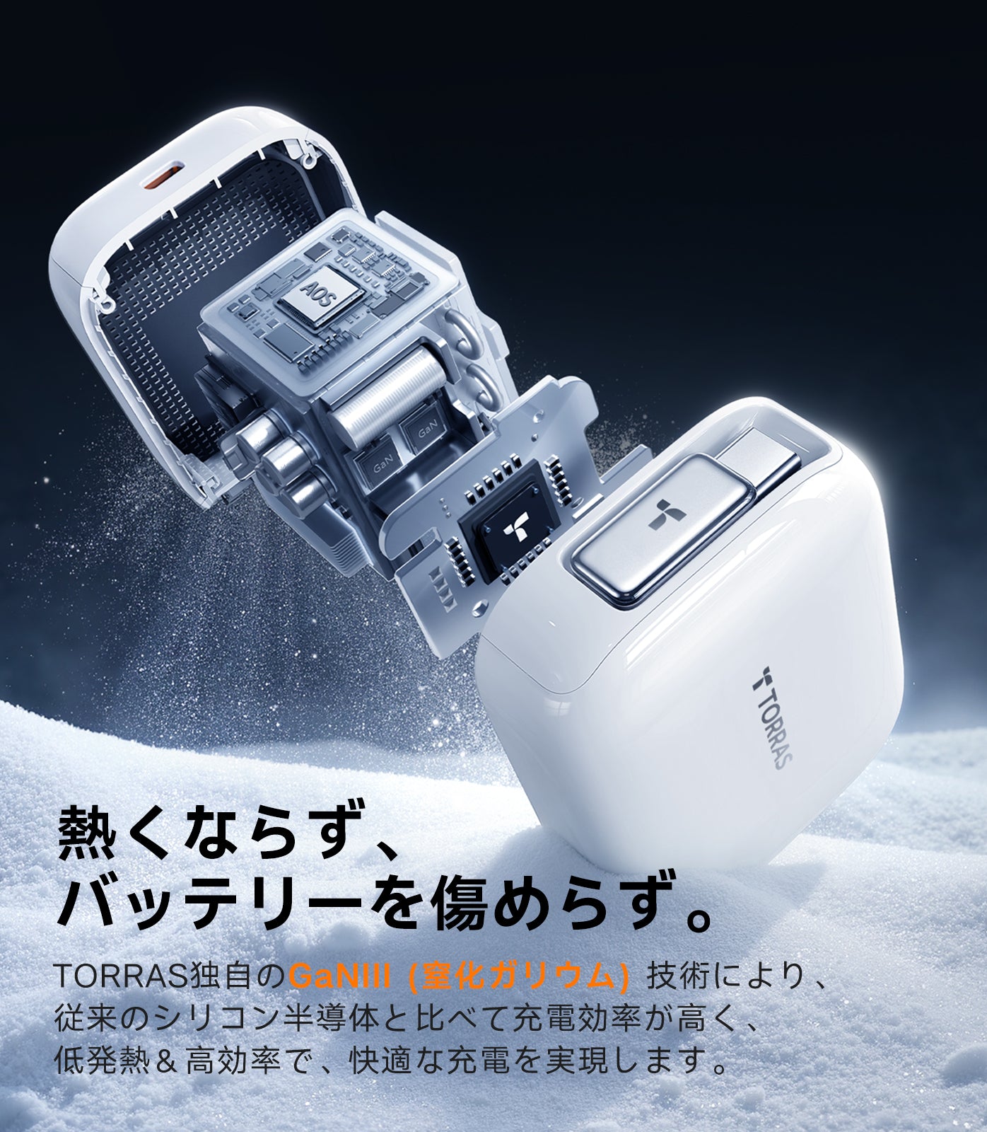 - デバイスの寿命を延ばし、低温で高效かつ安全に充電可能。スマート AI 適応で、長期間の使用にも耐える:独自の Torras-ice インテリジェント検知機能により、接続デバイスに合わせて自動で出力を調整。小電流デバイスにも対応し、2 台同時充電時は電力を智能的に分配し、総充電時間を短縮。