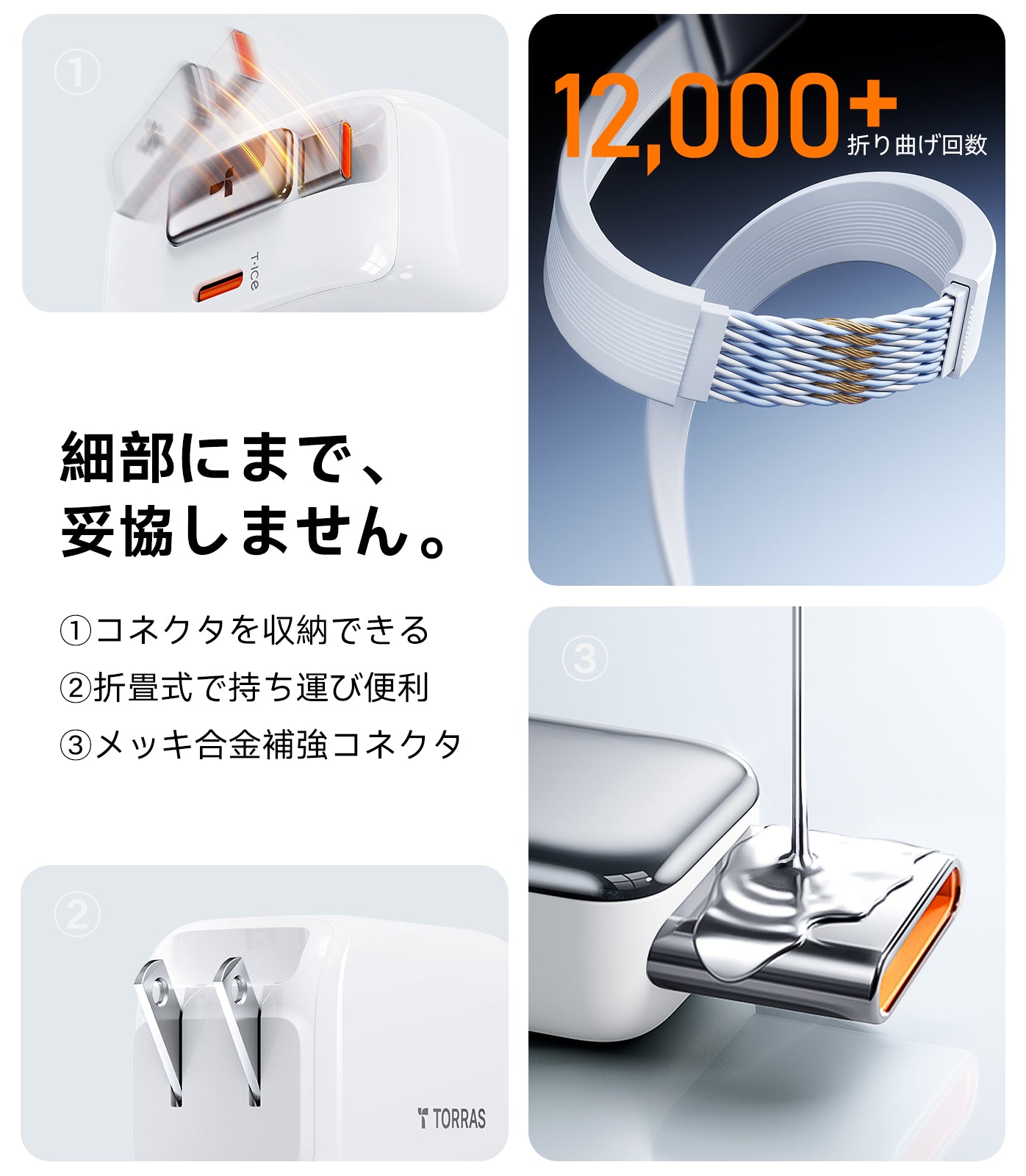 - 超高耐久性設計:ケーブルは 2 万回折り曲げ試験に合格。GaN 素材により小型化を実現し、使用寿命は 10 年に達する。携帯性と耐久性を両立。