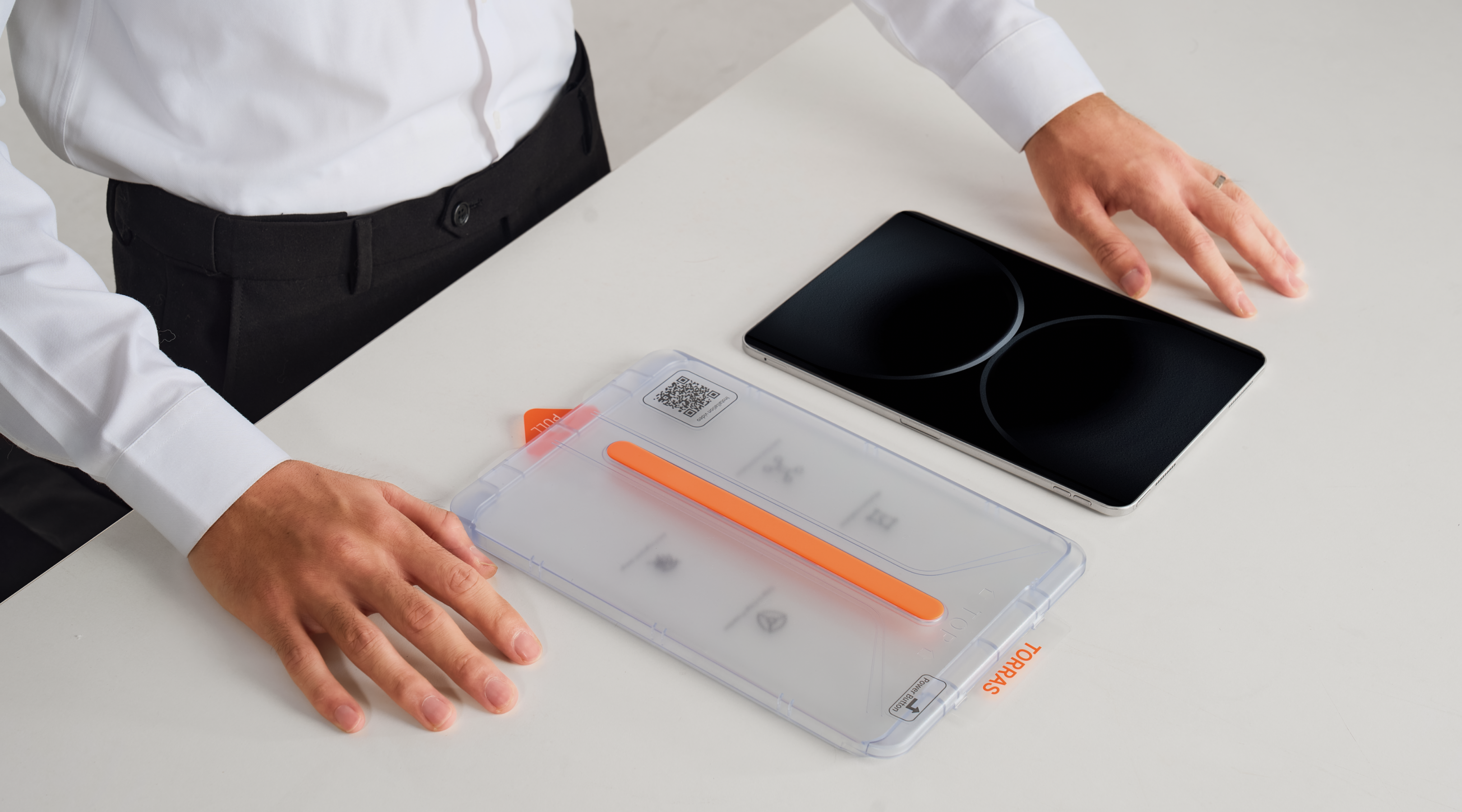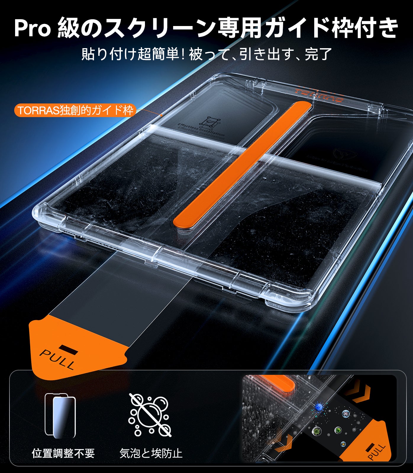 - TORRASの第四世代ガイド枠により、iPad インチフィルムを引っ張るだけで自動的に貼り付け完了